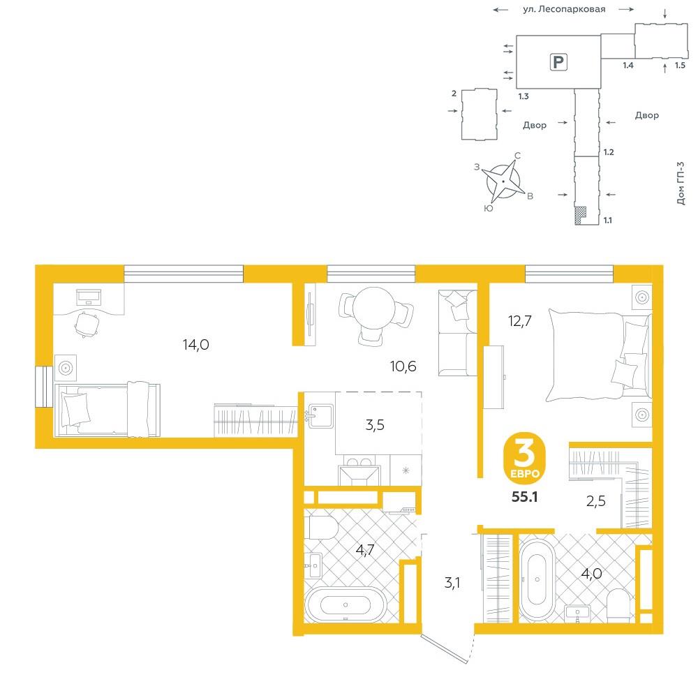 Квартира располагается в ГК «Чистые Пруды» от «Паритет девелопмент». Это флагманский проект компании в Тюмени. <br>Расположение вдали от шумных улиц и оживленного центра создает ощущение жизни на природе и окружает тишиной и спокойствием. Есть вся необходимая социальная и коммерческая инфраструктура: магазины и сфера услуг на первых этажах. Школы, сады, поликлиника, парки в шаговой доступности.<br>Квартал строится в районе Новой Лесобазы. Рядом выезд на объездную, что существенно экономит время. Поездка до центра города на автомобиле занимает 15-20 минут.<br>Городские кварталы «Чистые Пруды» сформирован из домов переменной этажности и многоуровневых паркингов. Ввод 1 очереди строительства запланирован на II кв. 2028 года. <br>Всё благоустройство квартала представлено двумя функциональными зонами: приватная внутри дворовая и общественная. Каждый закрытый двор имеет выход на единую променадную зону - бульвар.<br>Концепция благоустройства основана на принципе модульности, что формирует основную идею приватности. Приватность проекта подчеркивает его особенный климат внутри. Модульное благоустройство позволит максимально эффективно использовать пространство двора и удовлетворить потребности различных категорий жителей.<br>В квартирах базово выполнена улучшенная черновая отделка, которая включает в себя: выровненные стены, стяжка пола с шумоизоляцией, горизонтальная разводка отопления, установлены счетчики с телеметрией, окна с 5-камерным профилем и надежные входные двери.<br>При желании можно добавить ремонт от застройщика и включить его в стоимость ипотеки, что позволит сэкономить на стройматериалах и переехать сразу после получения ключей. <br>Характеристики квартиры:<br>этаж - 4<br>количество комнат - 3<br>номер помещения - 32<br>площадь квартиры - 55,1 кв.мГармоничные пропорции и большие окна наполняют пространство светом, создавая уютную атмосферу. Умное зонирование позволяет удобно организовать как рабочую, так и жилую зоны, что особенно важно для современных жителей. Санузел спроектирован с учетом всех потребностей: здесь есть ванна и место для стиральной машины. Каждый метр квартиры используется с максимальной эффективностью, что делает эту планировку отличным выбором для тех, кто ценит комфорт и удобство. |