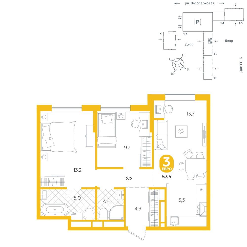 Квартира располагается в ГК «Чистые Пруды» от «Паритет девелопмент». Это флагманский проект компании в Тюмени. <br>Расположение вдали от шумных улиц и оживленного центра создает ощущение жизни на природе и окружает тишиной и спокойствием. Есть вся необходимая социальная и коммерческая инфраструктура: магазины и сфера услуг на первых этажах. Школы, сады, поликлиника, парки в шаговой доступности.<br>Квартал строится в районе Новой Лесобазы. Рядом выезд на объездную, что существенно экономит время. Поездка до центра города на автомобиле занимает 15-20 минут.<br>Городские кварталы «Чистые Пруды» сформирован из домов переменной этажности и многоуровневых паркингов. Ввод 1 очереди строительства запланирован на II кв. 2028 года. <br>Всё благоустройство квартала представлено двумя функциональными зонами: приватная внутри дворовая и общественная. Каждый закрытый двор имеет выход на единую променадную зону - бульвар.<br>Концепция благоустройства основана на принципе модульности, что формирует основную идею приватности. Приватность проекта подчеркивает его особенный климат внутри. Модульное благоустройство позволит максимально эффективно использовать пространство двора и удовлетворить потребности различных категорий жителей.<br>В квартирах базово выполнена улучшенная черновая отделка, которая включает в себя: выровненные стены, стяжка пола с шумоизоляцией, горизонтальная разводка отопления, установлены счетчики с телеметрией, окна с 5-камерным профилем и надежные входные двери.<br>При желании можно добавить ремонт от застройщика и включить его в стоимость ипотеки, что позволит сэкономить на стройматериалах и переехать сразу после получения ключей. <br>Характеристики квартиры:<br>этаж - 7<br>количество комнат - 3<br>номер помещения - 196<br>площадь квартиры - 57,5 кв.мГармоничные пропорции и большие окна наполняют пространство светом, создавая уютную атмосферу. Умное зонирование позволяет удобно организовать как рабочую, так и жилую зоны, что особенно важно для современных жителей. Санузел спроектирован с учетом всех потребностей: здесь есть ванна и место для стиральной машины. Каждый метр квартиры используется с максимальной эффективностью, что делает эту планировку отличным выбором для тех, кто ценит комфорт и удобство. |