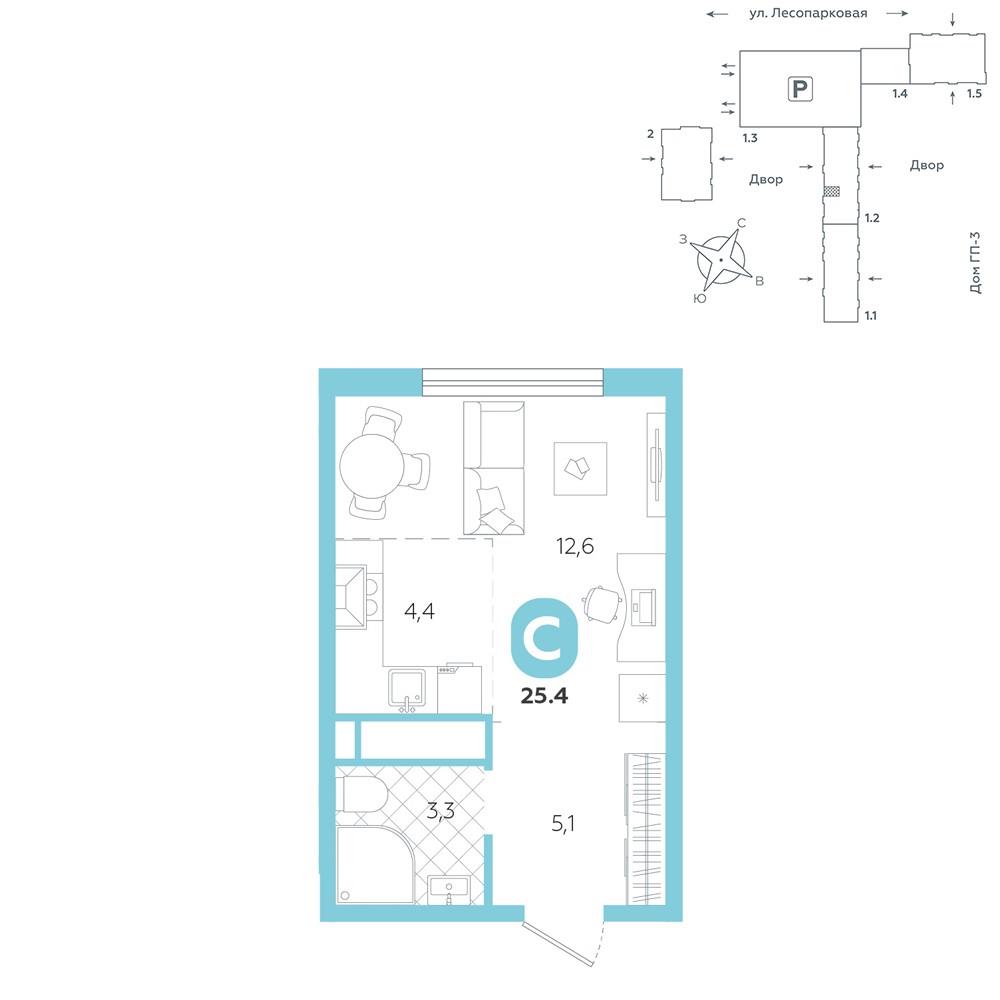 общая 25,4 м2, жилая 12,6 м2, кухни 4,4 м2 |