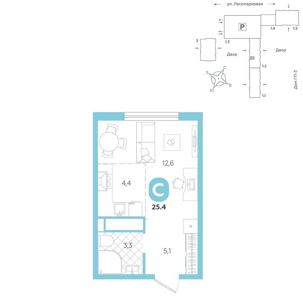 общая 25,4 м2, жилая 12,6 м2, кухни 4,4 м2 |