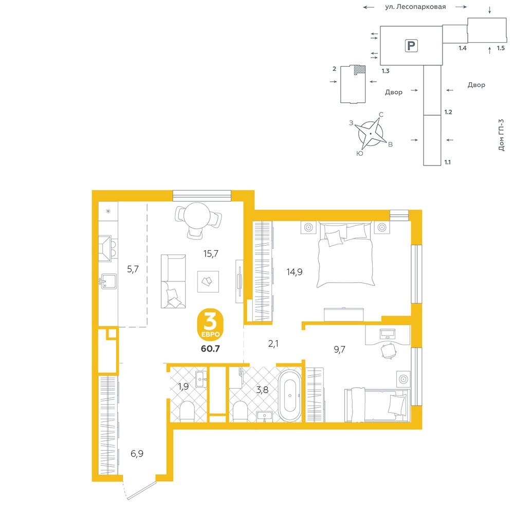 Квартира располагается в ГК «Чистые Пруды» от «Паритет девелопмент». Это флагманский проект компании в Тюмени. <br>Расположение вдали от шумных улиц и оживленного центра создает ощущение жизни на природе и окружает тишиной и спокойствием. Есть вся необходимая социальная и коммерческая инфраструктура: магазины и сфера услуг на первых этажах. Школы, сады, поликлиника, парки в шаговой доступности.<br>Квартал строится в районе Новой Лесобазы. Рядом выезд на объездную, что существенно экономит время. Поездка до центра города на автомобиле занимает 15-20 минут.<br>Городские кварталы «Чистые Пруды»сформирован из домов переменной этажности и многоуровневых паркингов. Ввод 1 очереди строительства запланирован на II кв. 2028 года. <br>Всё благоустройство квартала представлено двумя функциональными зонами: приватная внутри дворовая и общественная. Каждый закрытый двор имеет выход на единую променадную зону - бульвар.<br>Концепция благоустройства основана на принципе модульности, что формирует основную идею приватности. Приватность проекта подчеркивает его особенный климат внутри. Модульное благоустройство позволит максимально эффективно использовать пространство двора и удовлетворить потребности различных категорий жителей.<br>В квартирах базово выполнена улучшенная черновая отделка, которая включает в себя: выровненные стены, стяжка пола с шумоизоляцией, горизонтальная разводка отопления, установлены счетчики с телеметрией, окна с 5-камерным профилем и надежные входные двери.<br>При желании можно добавить ремонт от застройщика и включить его в стоимость ипотеки, что позволит сэкономить на стройматериалах и переехать сразу после получения ключей. <br>Характеристики квартиры:<br>этаж - 23<br>количество комнат - 3<br>номер помещения - 215<br>площадь квартиры - 60,7 кв.м<br>Гармоничные пропорции и большие окна наполняют пространство светом, создавая уютную атмосферу. Умное зонирование позволяет удобно организовать как рабочую, так и жилую зоны, что особенно важно для современных жителей. Санузел спроектирован с учетом всех потребностей: здесь есть ванна и место для стиральной машины. Каждый метр квартиры используется с максимальной эффективностью, что делает эту планировку отличным выбором для тех, кто ценит комфорт и удобство. |