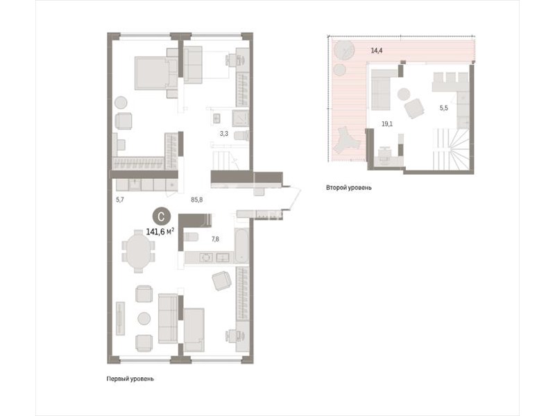 Двухуровневая квартира общей площадью 141,6 м² напоминает загородный дом. Расположенная на пятом этаже монолитного здания, она предлагает не только комфорт и простор, но и потрясающие виды.Квартира свободной планировки, что позволяет реализовать самые смелые дизайнерские решения и зонирование пространства. Например, можно разделить пространство на приватное и общественное: на одном этаже расположить спальни, а на другом — хозяйственные помещения и кухню-гостиную.<br />