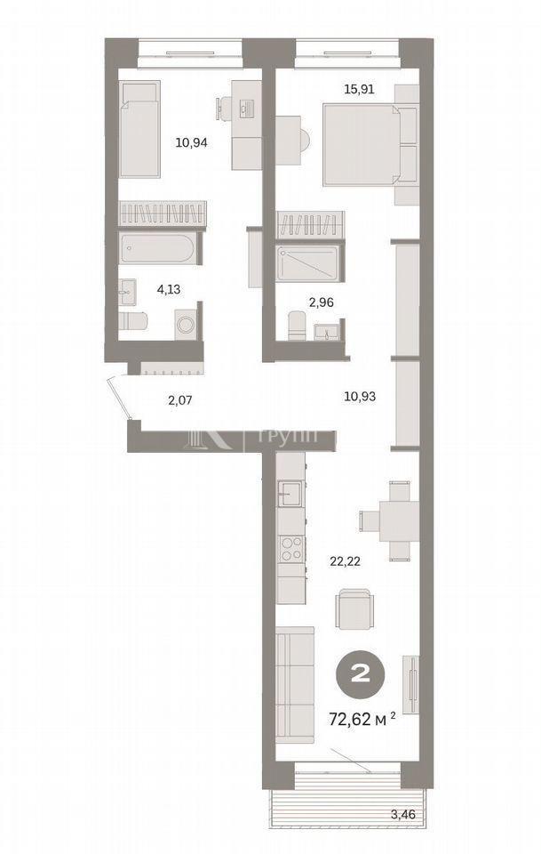 Общая площадь квартиры составляет 72,6 квадратных метров, из которых 26,85 квадратных метров приходится на жилую площадь, а 22,22 квадратных метров — на просторную кухню. В квартире две изолированные комнаты, одна из которых — мастер-спальня. Планировка также предусматривает ниши под шкафы, а окна выходят на запад и восток, обеспечивая естественное освещение в течение всего дня.<br />