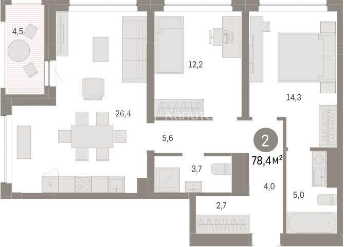 Дом комфорт-класса ждёт своих новых жильцов. Квартира расположена на 7-м этаже 17-этажного монолитно-кирпичного здания. Общая площадь — 78,7 м², из которых 26,4 м² занимает просторная кухня-гостиная. Правильная форма помещения позволяет реализовать множество дизайнерских решений, а большие окна обеспечивают огромное количество естественного освещения.<br />