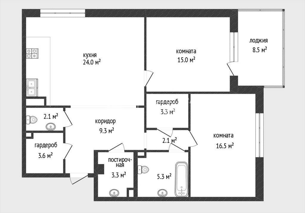 кухня-гостиная, 2 спальни -16,5, 16 м. кв. , лоджия 8,6 м. кв. - утеплена застеклена, 2 гардеробных, 2 санузла , сантехника - Франция , техкомната- постирочная, теплые полы , водонагреватель, окна Salamander все 3- х створчатые .<br />