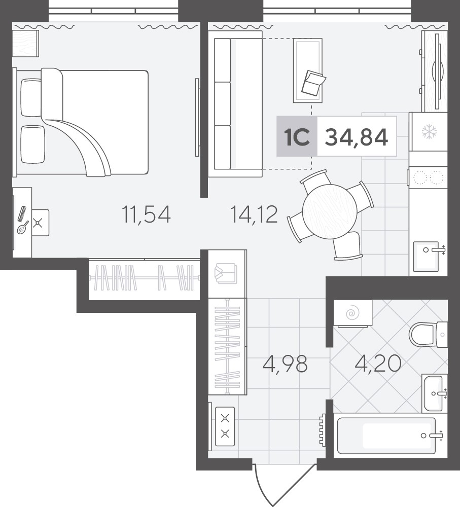 общая 34,84 м2, жилая 11,54 м2, кухни 14,12 м2 |