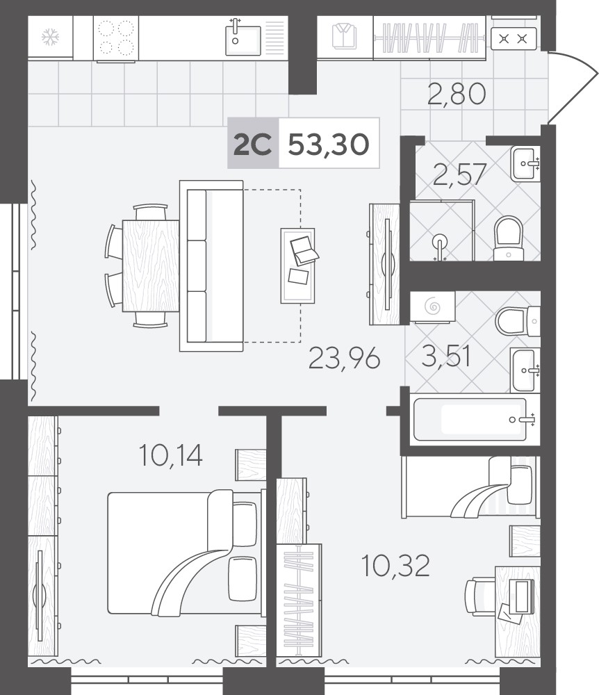 общая 34,44 м2, жилая 20,46 м2, кухни 23,96 м2 |