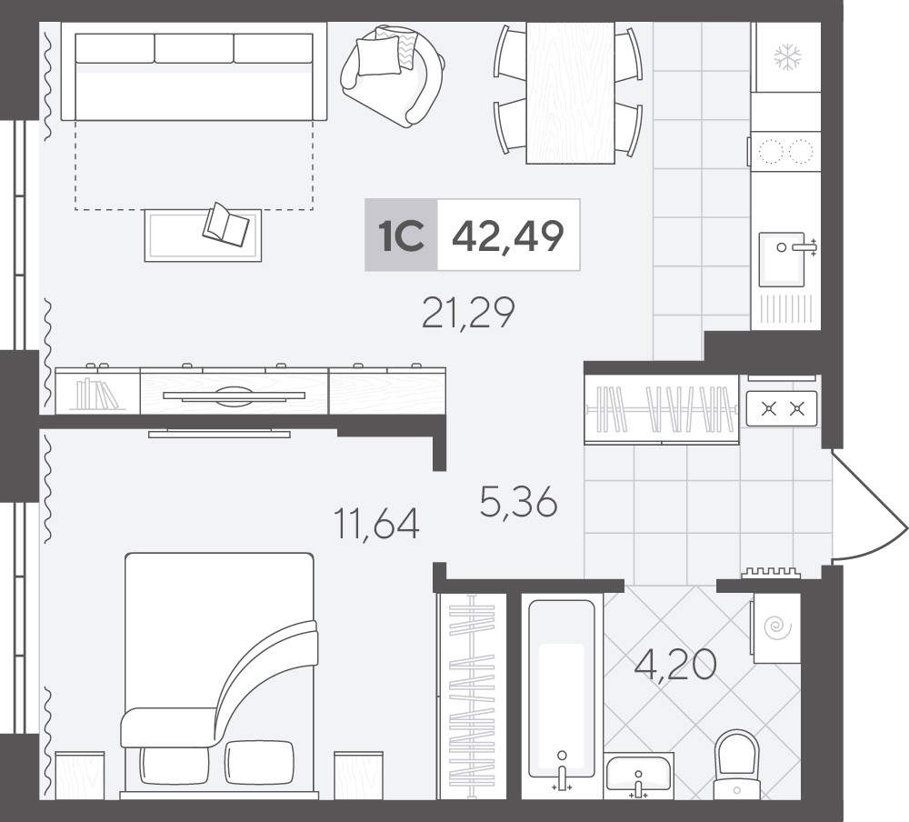 общая 42,49 м2, жилая 11,64 м2, кухни 21,29 м2 |