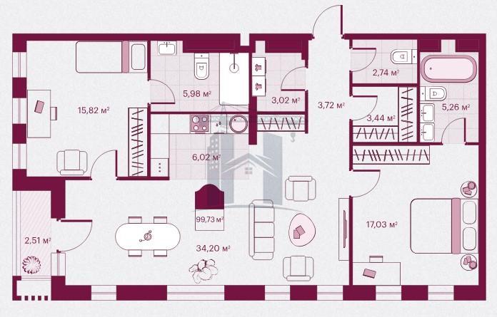 общая 99,73 м2, жилая 5 м2, кухни 5 м2 |